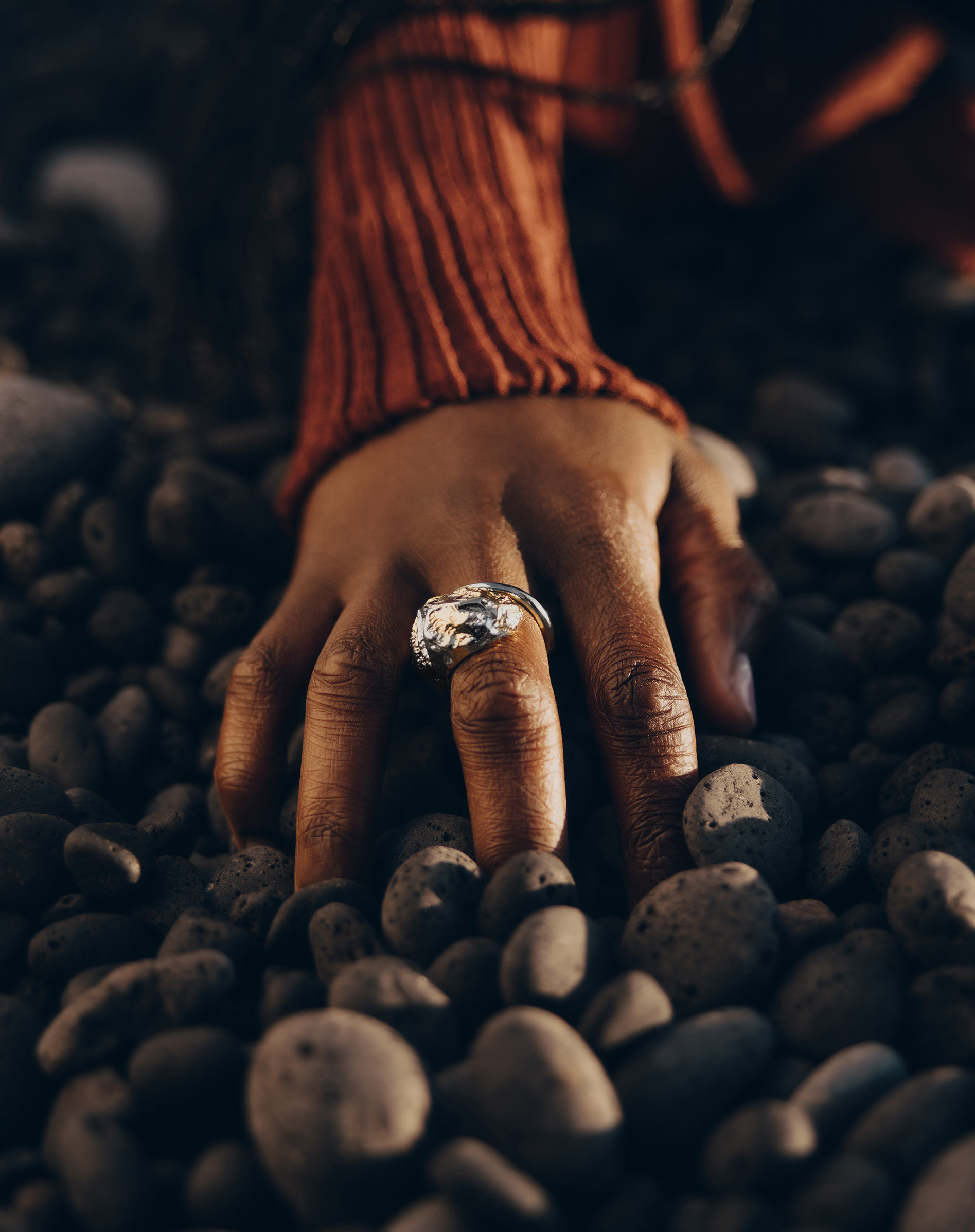 The beauty of the Eroz “Duo Edition” ring comes from the contrast between the roughness of the large rock and the refined polish of the ring itself.