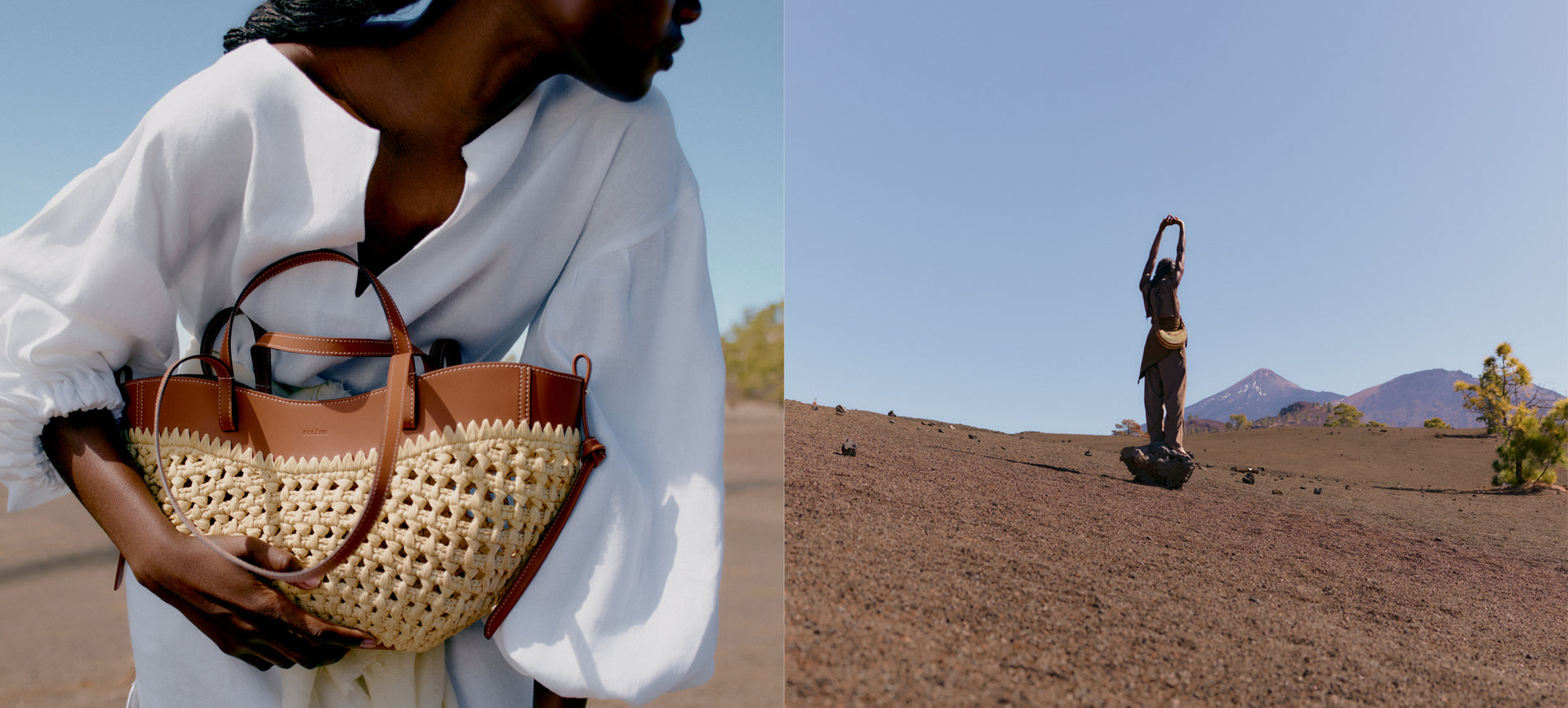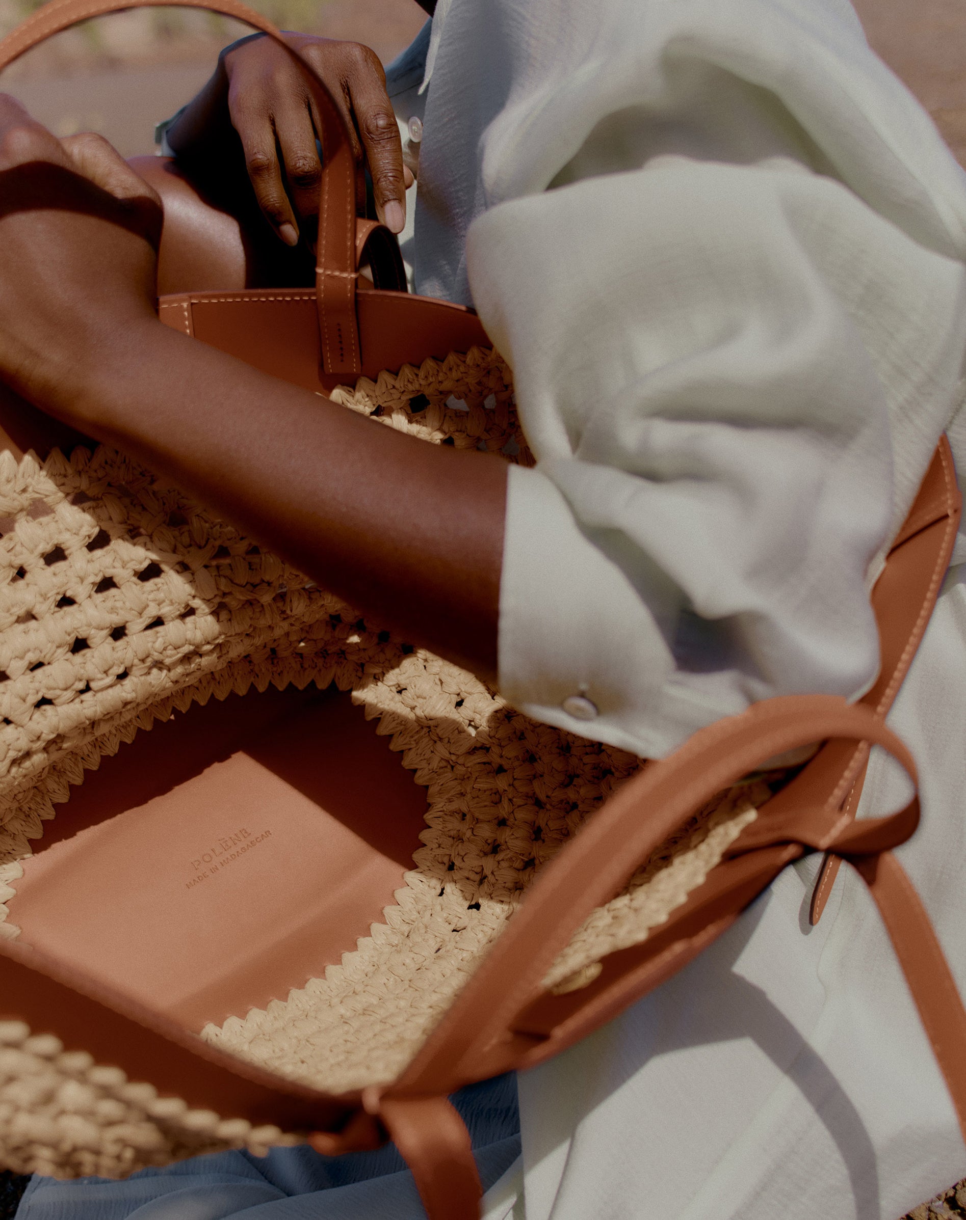 For the first time, three Polène models are adorned with this organic material, which is as supple as it is resilient. Somewhere between sculpted tote and basket, the Cyme and Cyme Mini are dressed in raffia through a unique combination of crochet stitches. For the Numéro Dix, the rice stitch technique is used for the half-moons, also crocheted in raffia. On all bags, leather and raffia are joined by hand-embroidered stitches, symbolizing the harmonious balance between these materials.